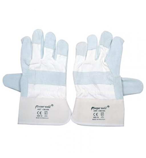 COW SPLIT LEATHER WHITE DRILL COTTON WITH RUBBERIZED SAFETY CUFF SIZE : 10″ PACKAGE : 1DOZ